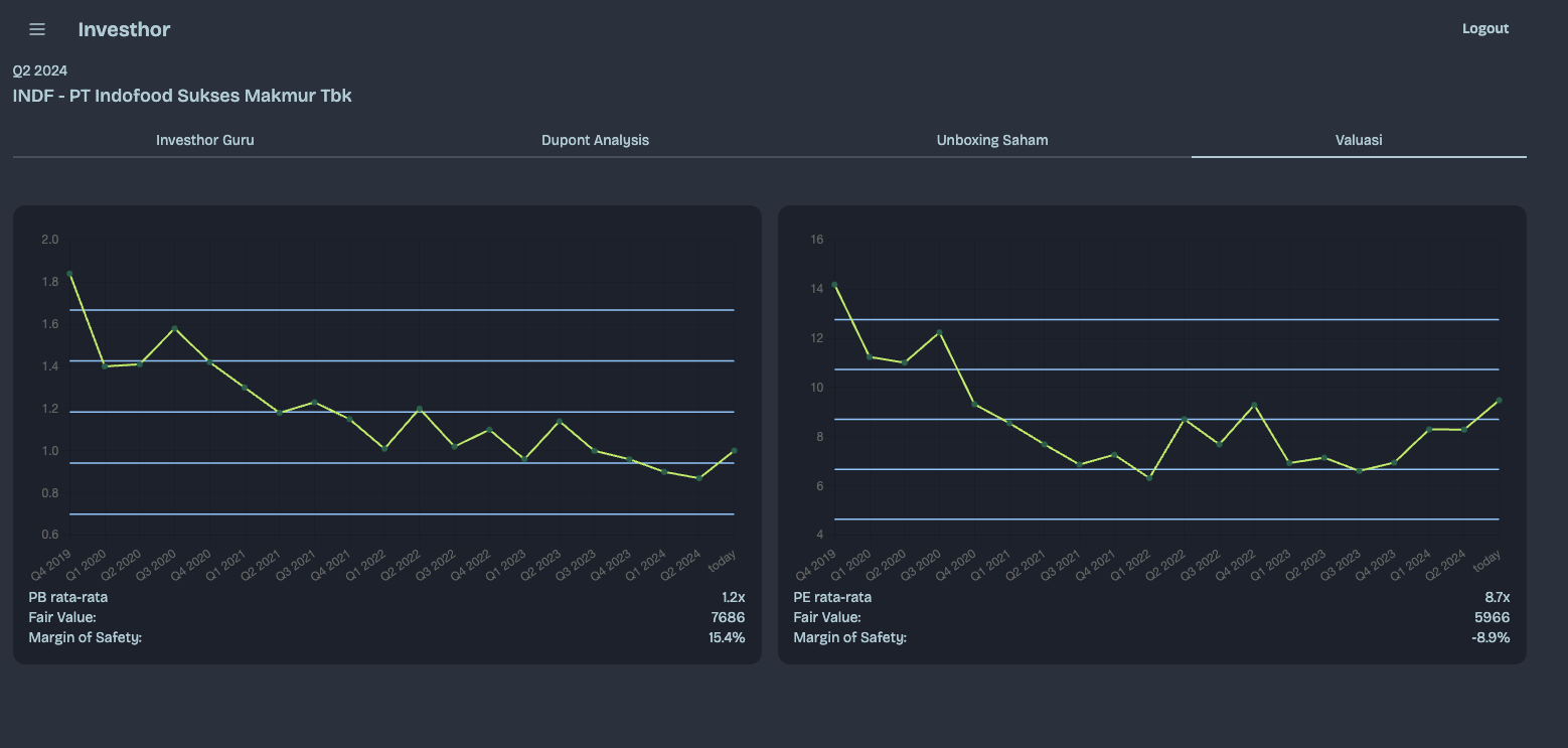 Relatif Valuation (PE Band & PB Band): Untuk saham dengan PER & PBV yang lebih dari 10x dan 1x bisa bandingkan valuasi saham dengan data historis untuk menentukan apakah harga saat ini memberikan margin of safety yang cukup. Fitur ini tersedia pada halaman saham bagian valuasi di investhor, termasuk fair value & margin of safety yang ditawarkan.